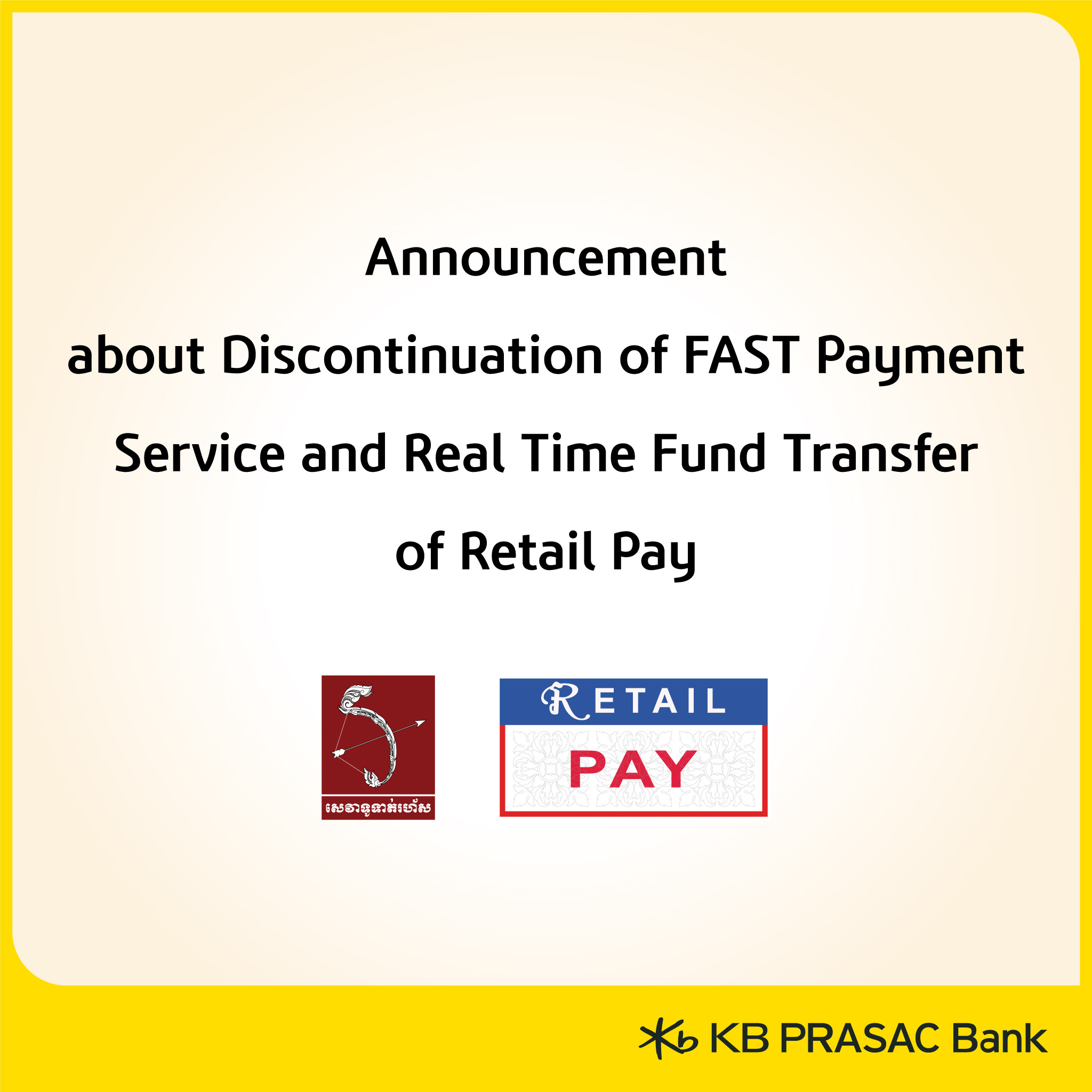 Please be informed that, starting from 08th December 2025 onwards, KB PRASAC Bank will no longer a member of the FAST Payment Service and the Real Time Fund Transfer Service of Retail Pay, and as a result, all transactions of these services will be permanently discontinued.