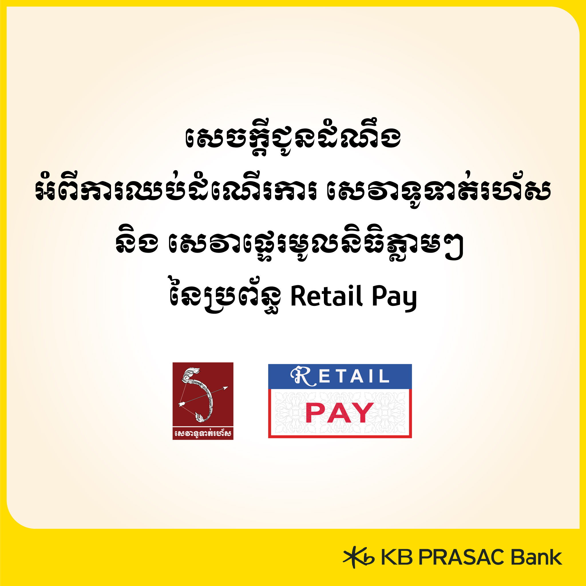 ធនាគារ ខេប៊ីប្រាសាក់ សូមជម្រាបជូនអតិថិជនទាំងអស់មេត្តាជ្រាបថា ចាប់ពីថ្ងៃទី 08 ខែធ្នូ ឆ្នាំ 2025 នេះតទៅ ធនាគារ ខេប៊ីប្រាសាក់ នឹងលែងជាសមាជិកនៃប្រព័ន្ធសេវាទូទាត់រហ័ស (FAST Payment Service) និង សេវាផ្ទេរមូលនិធិភ្លាមៗ (Real Time Fund Transfer Service) នៃប្រព័ន្ធ Retail Pay ទៀតហើយ ដូចនេះរាល់ប្រតិបត្តិការផ្ទេរប្រាក់តាមសេវាទាំងពីរខាងលើនឹងឈប់ដំណើរការផងដែរ។
