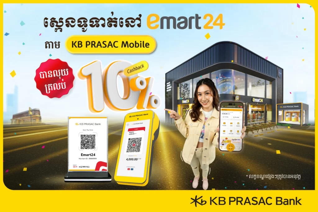 អតិថិជនប្រើ KB PRASAC Mobile ស្កេនទូទាត់នៅ emart24 បានលុយត្រលប់វិញ 10% ភ្លាមៗ